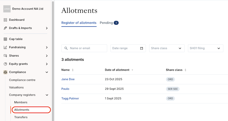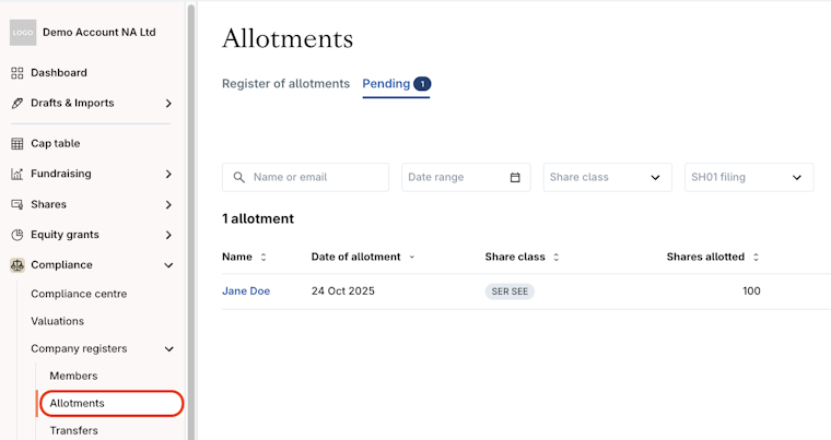 1. Navigate to Company registers > Allotments > Pending.