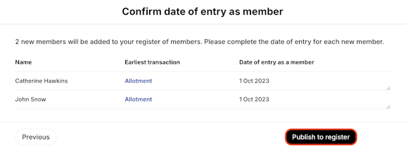 4. Confirm date of entry as a member for each shareholder > Publish to register.