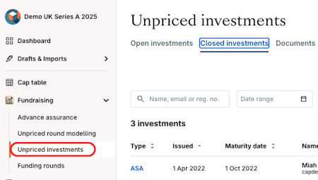 1. Navigate to Fundraising > Unpriced investments > Closed investments.