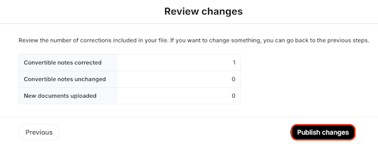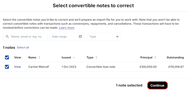 You can also correct convertible notes individually. Corrections to convertible notes will trigger notifications to holders highlighting the changes.