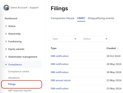 1. Navigate to Compliance > Filings > HMRC.