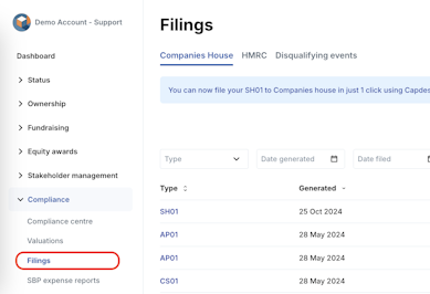 1. Navigate to Compliance > Filings > Companies House.