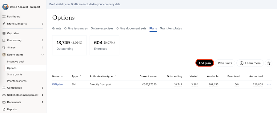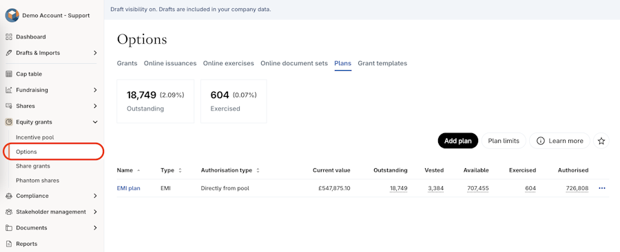 1. Navigate to Equity grants > Options > Plans.