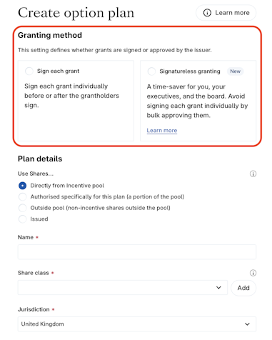 Jurisdiction: if the jurisdiction is UK, you will be able to select a type (EMI, CSOP or Other).