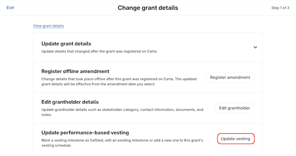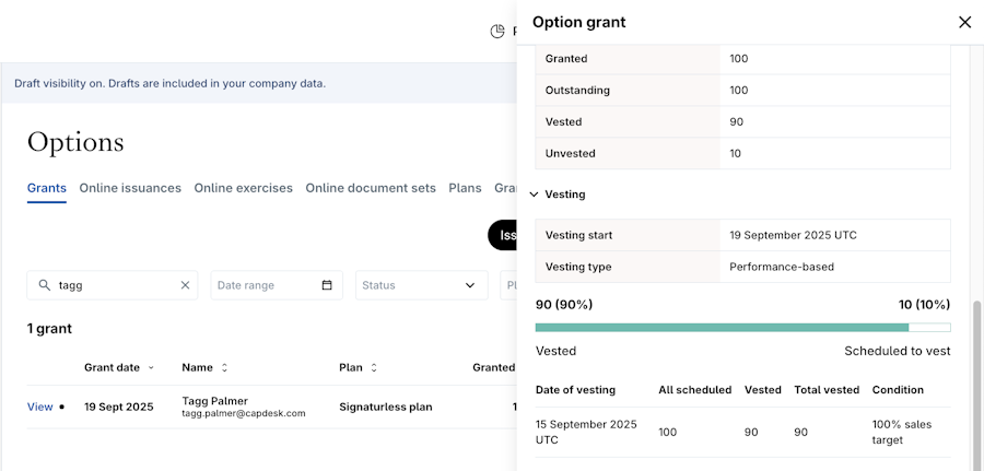 The performance-based vesting schedule allows for customization of tranches that do not fit Carta's standard time-based schedule types. For the purpose of this article, we will use an option grant as an example.