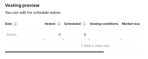 6. In Vesting Preview you will be able to create each tranche of your performance-based vesting schedule. If you want to add a new tranche to the vesting schedule click on Add new row.