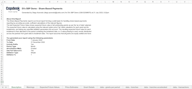 This worksheet is a summary of the Price Estimates tab. It will provide the Option rollforward of the activity of options within the period.