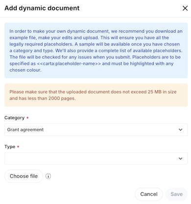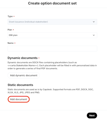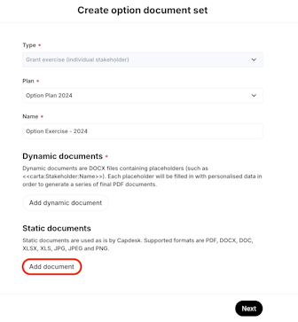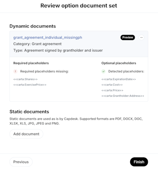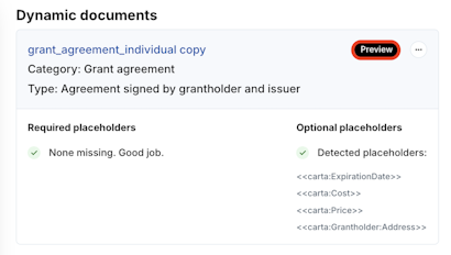 A document set is a group of documents you can reuse in online grant issuances and exercises. This set includes dynamic documents, which are templates with placeholders that Carta automatically fills with personalized data for each holder, and static documents, which do not require personalization.