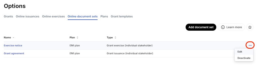 Once the document set is created, you can edit the document by navigating Equity awards > Options > Online Document Sets > action button > Edit.