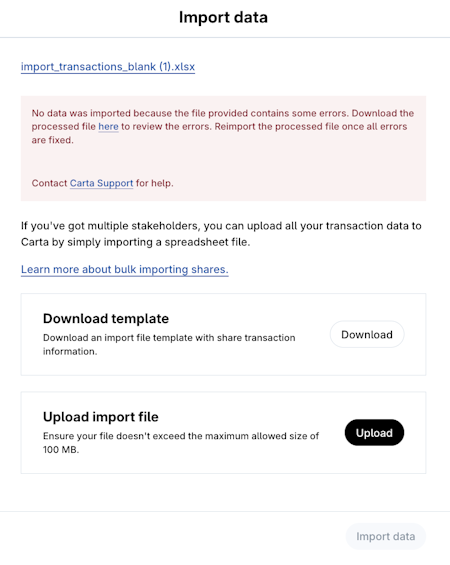 You can import share issuances in bulk using an excel spreadsheet available in Carta.