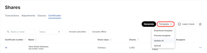 3. To update all current registered and in draft certificate with a new template, once added, click Template then Update all.