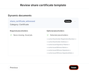5. Review the share certificate template details and click Finish.