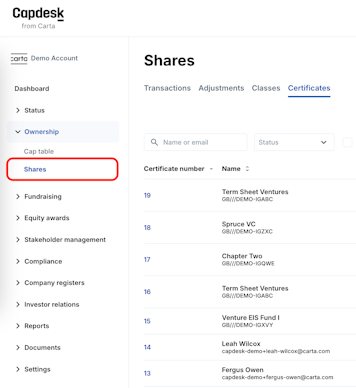 1. Go to Ownership > Shares > Certificates.