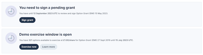 At the top of the page, you will see any new notifications of grant issuances or active exercises.