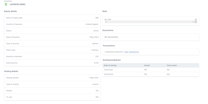 This section is an overview of all the grants you have been issued, detailing information such as the number of grants issued, the number of vested as well as what is left to vest or exercised (if applicable). You can have a quick view of these details, by navigating through the slider, or you can click on the Grant details button in the top right corner, to dive into a more detailed view.