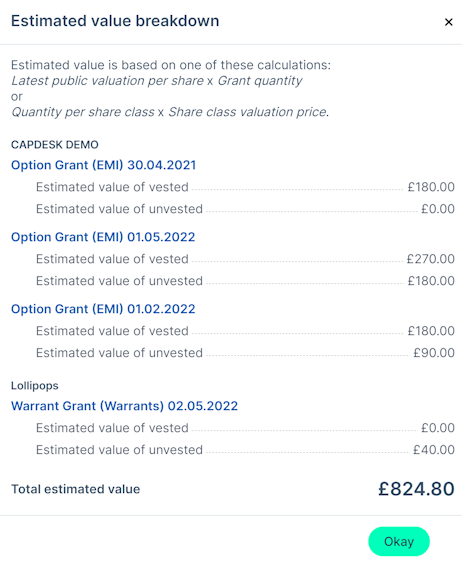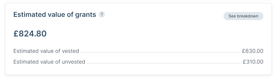By clicking on the See breakdown button on the top right corner of the box, you'll be able to see a detailed view of the estimated value of vested and unvested shares for each grant you have been issued.