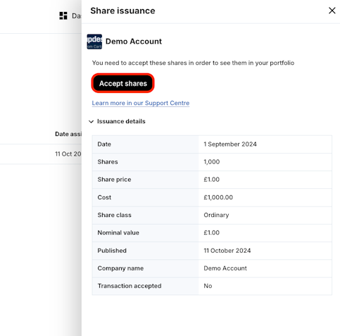 3. Click Accept shares to complete the acceptance process.