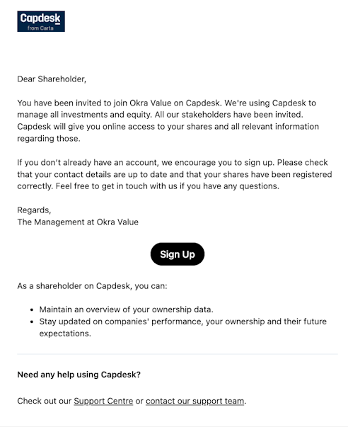 1. Click Sign up/View investment in the email notification received in your inbox. If you don't have an account yet, you can sign up to Carta before moving to step 2.