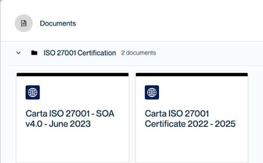 6. Navigate to Documents > ISO 27001 Certification. The ISO certification listed in that folder include certification for Carta.