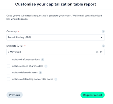 4. Customize your cap table report by setting the following parameters: