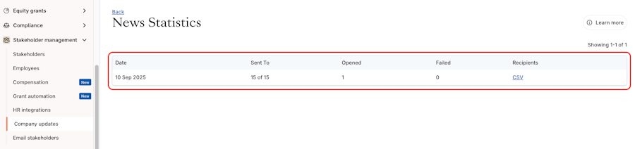 7. The statistics include the number of shareholders that the update was sent to, as well as the number of opened and failed notifications and an export file with the statistic details.