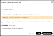 Preview email / Preview update - you can preview the way the emails will look like when they are sent to your shareholders as well as how the updates will show once published;