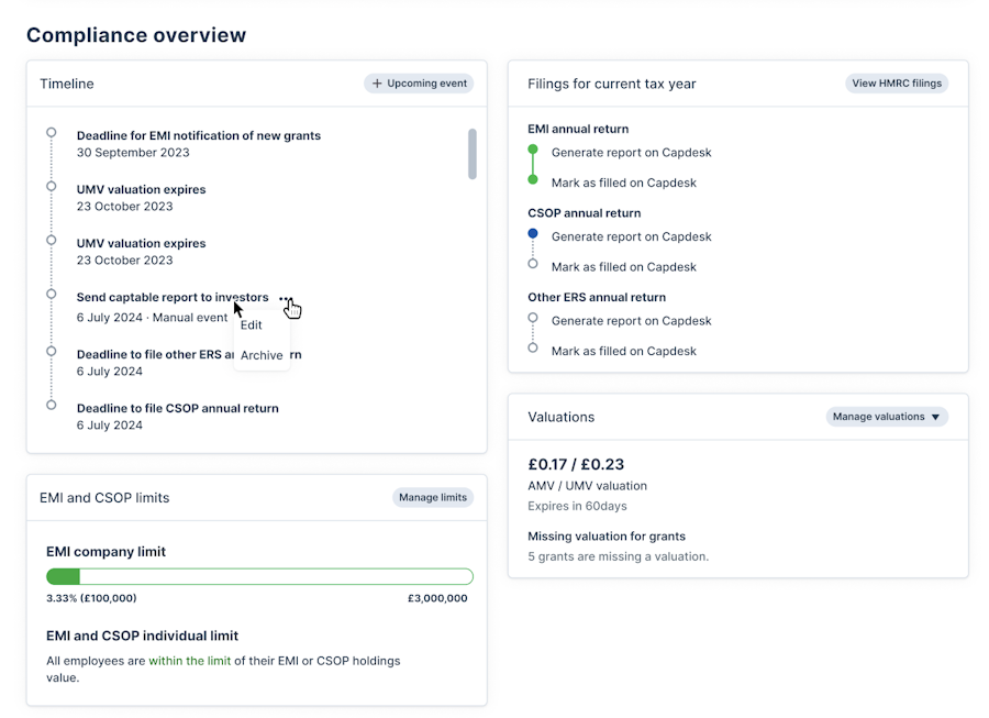 The timeline shows a list of events in order to maintain your tax-advantageous schemes compliant. The events range from adding valuations to filing notifications to the HMRC. Administrators will also be able to click + Upcoming event offering a more personalized experience that will cater for different companies' necessities.