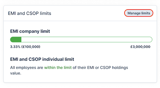 Click Manage Limits to see a detailed breakdown of your companies EMI/CSOP Limits by stakeholder