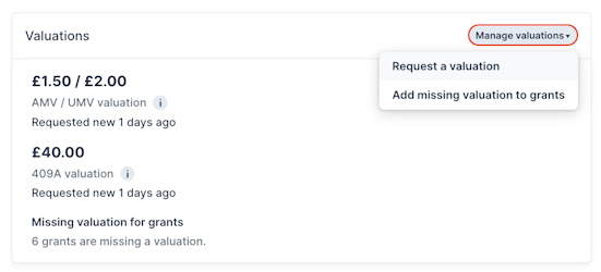 Click Manage valuations to either request a new valuation or manually add missing valuations to the grants in the system.
