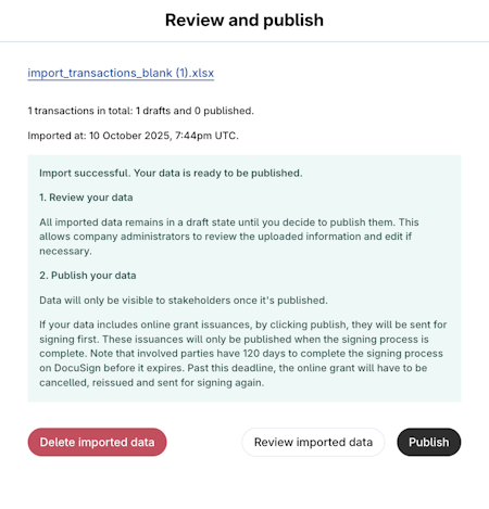 7. The platform will process the data in the file as drafts. Click Publish to publish the transactions or Review Imported Data to review them in draft status.