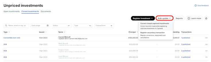 You can bulk correct errors made while registering convertible loan notes in Carta.