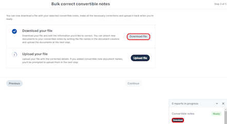 6. Update the spreadsheet and click Upload file when you are ready to process the changes on the platform. If there are any errors, Carta will provide you with a file detailing the errors and how to correct them.