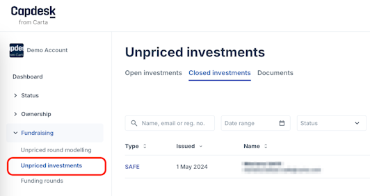 1. Navigate to Fundraising > Unpriced investments > Closed investments.