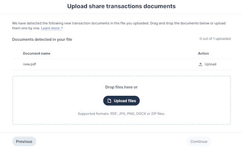 8. (Optional) If documents were added to any of the loan notes corrected, then you’re required to upload the identified documents before continuing, by dropping the files in the box or by clicking Upload files.