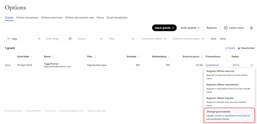 In the Options page click on the Action Button next to the grant > Change grant details.