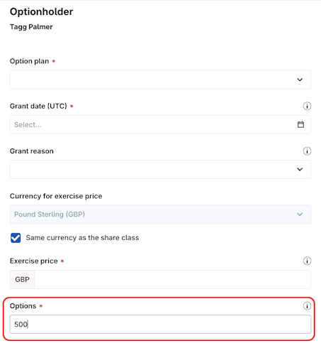4. Enter the details related to the option. The required details (marked with a red asterisk on the platform) will vary according to the equity type. The main field to note in this instance is Options, as the total amount of equity granted has to match the total amount of equity that vests in the performance-based vesting schedule. In this example, we are granting 40 options.