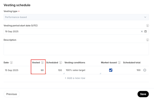 6. In Vesting Preview you will be able to create each tranche of your performance-based vesting schedule. If you want to add a new tranche to the vesting schedule click on Add new row.