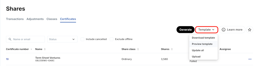 1. Go to Shares > Certificates > Template > Preview template.