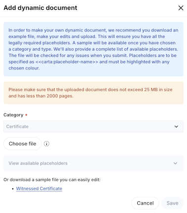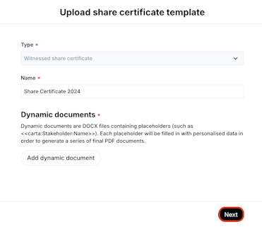 4. Click Add dynamic document to upload your own personalized share certificate template utilizing the placeholders or customize the downloadable template to align with your preferences and upload it. Save to proceed.