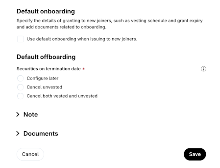 • Default onboarding: Specify the details of granting to new joiners, such as vesting schedule and grant expiry and add documents related to onboarding. If not applicable, leave the checkbox unticked.