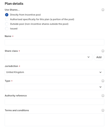 • Jurisdiction: if the jurisdiction is UK, you will be able to select a type (EMI, CSOP or Other).