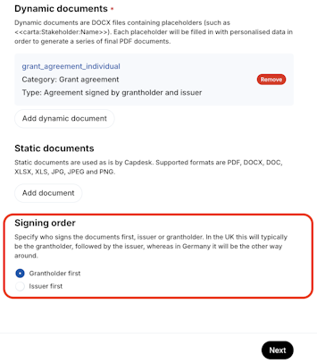 7. Choose who will be the first to sign the agreement - the Grantholder or the Issuer (your company).