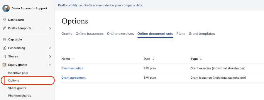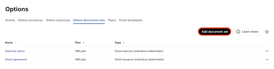 Once the document set is created, you can edit the document by navigating Equity awards > Options > Online Document Sets > action button > Edit.