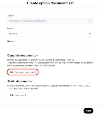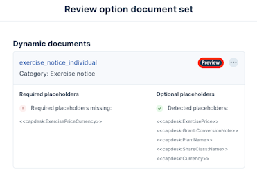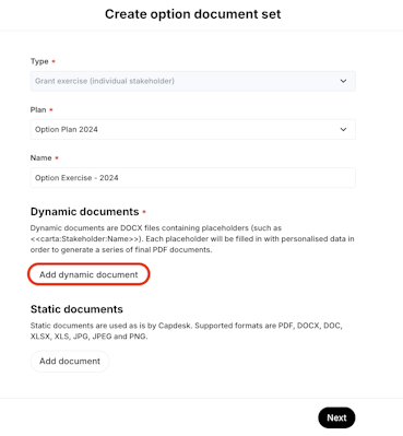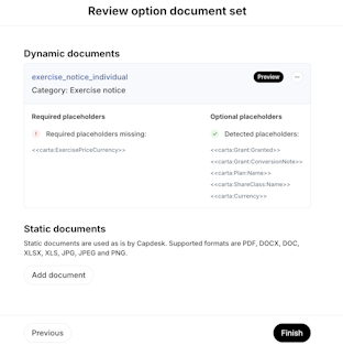 A document set is a group of documents you can reuse in online grant issuances and exercises. This set includes dynamic documents, which are templates with placeholders that Carta automatically fills with personalized data for each holder, and static documents, which do not require personalization.