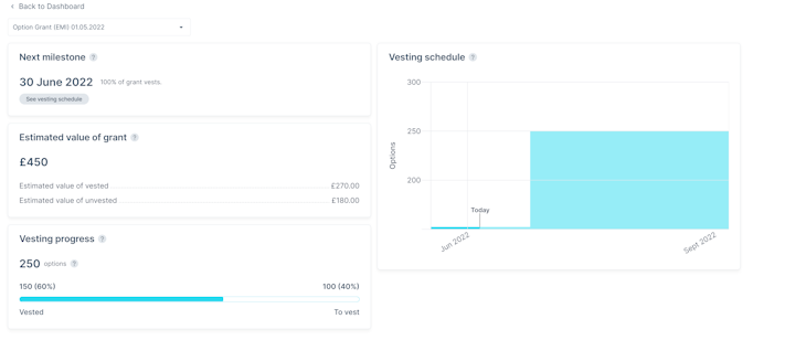 Primarily for employees, the dashboard offers a detailed view of your grants such as the vesting schedule, grants timeline or the estimated value of your grants (if applicable).