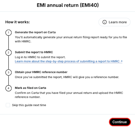 The Annual Returns is a compulsory filing that must be delivered to the HMRC on or before 6 July in a tax year. The Annual Return lists all relevant changes regarding your EMI, CSOP and Unapproved schemes within the tax year. You can generate the EMI Annual Return, CSOP Annual Return and Other ERS Annual Return in Carta.