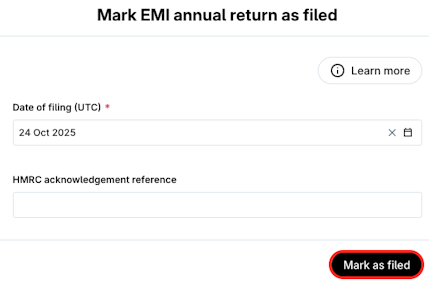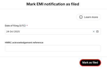8. When marking a report as filed complete with the Date of filing and HMRC reference code you received upon submission and click Mark as Filed.