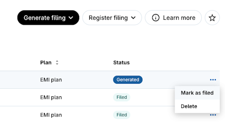 7. In the filings page, click the Actions Button to either Mark as Filed or Delete it.