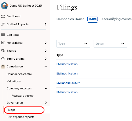 1. Navigate to Compliance > Filings > HMRC.