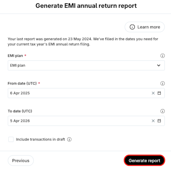 Include transactions in draft - Include in the filing any EMI options that might not have been published and are kept in draft.